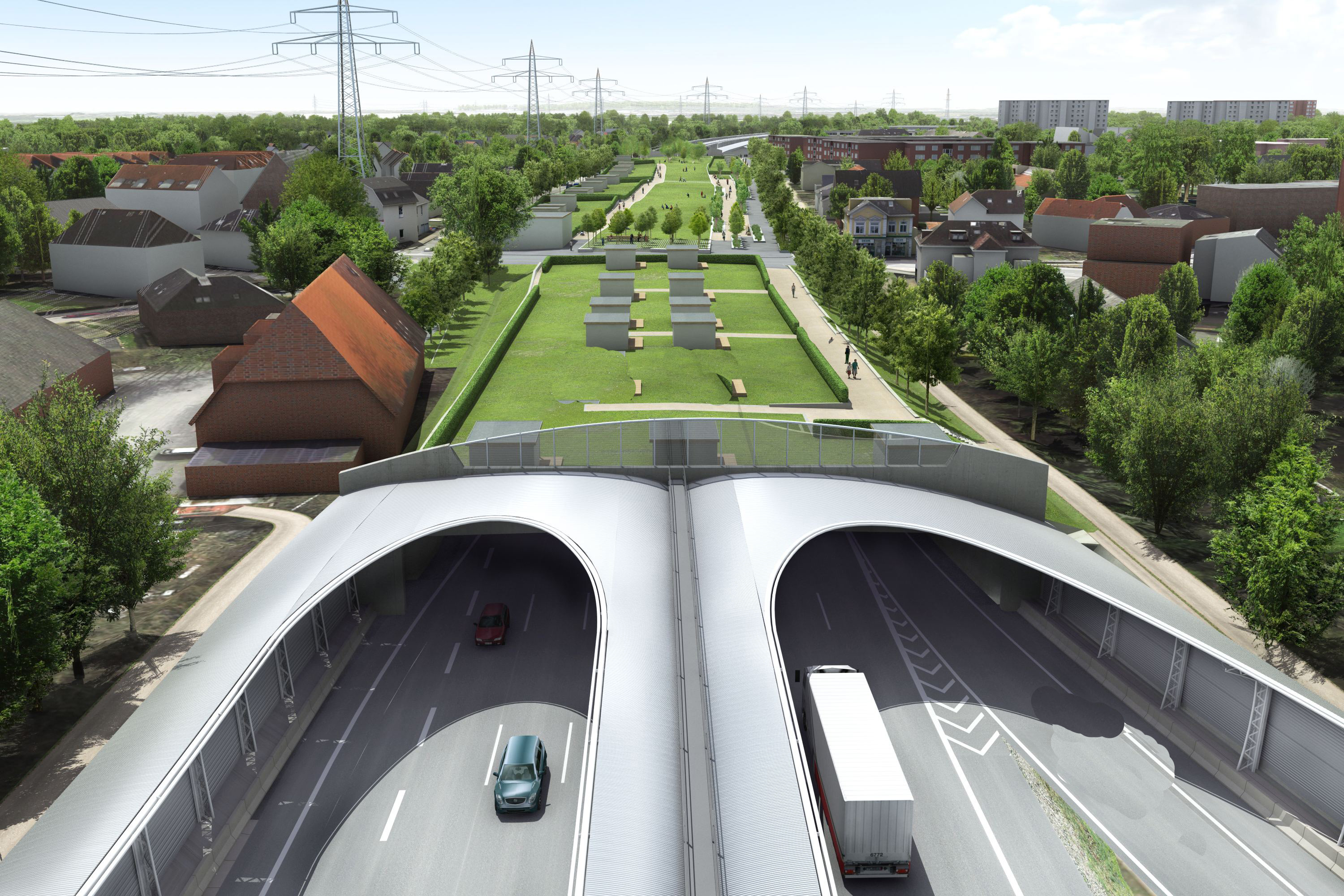 Autobahn A7 "Schnelsen Deckel" Bau eines Lärmschutztunnels Hamburg-Schnelsen. Der so genannte "Schnelsen Deckel" Baubeginn Juni 2015 Der "Schnelsentunnel" ist 550 Meter lang und verläuft von der Heidlohstraße im Süden bis zur Anschlussstelle HH-Schnelsen.